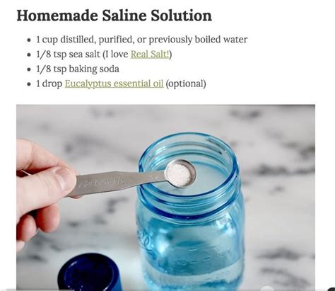 DIY Nasal Saline Solution Don't Waste the Crumbs from dontwastethecrumbs.com DIY Saline Solution: A Comprehensive Guide Saline solution is a common household item used for various purposes such as cleaning wounds, nasal irrigation, and contact lens cleaning. While it is readily available in drugstores and pharmacies, making your own saline solution is an easy and cost-effective alternative. In this article, we will explore the benefits of DIY saline solution and provide a step-by-step guide on how to make it at home. Why DIY Saline Solution? The primary benefit of making your own saline solution is the cost-effectiveness. Saline solution is a simple mixture of salt and water, and the ingredients required are readily available in most households. Additionally, commercial saline solutions often contain preservatives and other additives that may not be suitable for everyone. By making your own saline solution, you can control the ingredients and ensure that it is safe and effective for your needs. Another advantage of DIY saline solution is the convenience. You can make it at home at any time, without having to run to the store. This is particularly helpful for those who use saline solution frequently, such as contact lens wearers or individuals who suffer from allergies or sinus problems. Topic 1: How to Make DIY Saline Solution To make your own saline solution, you will need the following ingredients and equipment: - Salt (preferably non-iodized) - Water (preferably distilled or boiled) - Measuring cup and spoons - Clean container for storage Step 1: Measure out 1 cup of distilled or boiled water and pour it into a clean container. Step 2: Add 1 teaspoon of salt to the water and stir until it dissolves completely. Step 3: Your DIY saline solution is now ready to use. You can transfer it to a clean, airtight container for storage. Topic 2: Uses of DIY Saline Solution DIY saline solution has a wide range of uses, including: 1. Wound cleaning: Saline solution can be used to clean wounds and prevent infection. It is a gentle and effective alternative to harsher antiseptics. 2. Nasal irrigation: Saline solution can be used for nasal irrigation to relieve congestion, allergies, and sinusitis. It helps to flush out mucus and allergens from the nasal passages. 3. Contact lens cleaning: Saline solution can be used to rinse and store contact lenses. It is a gentle alternative to commercial contact lens solutions that may contain preservatives and other additives. Topic 3: DIY Saline Solution vs. Commercial Saline Solution While DIY saline solution is a cost-effective and convenient alternative to commercial saline solution, it is important to note that there are some differences between the two. Commercial saline solutions are often formulated to mimic the natural salt concentration of the human body, which may be more effective for some uses such as nasal irrigation. Additionally, commercial saline solutions may contain other ingredients such as buffering agents or preservatives that may provide additional benefits. However, for most household uses, DIY saline solution is a safe and effective alternative to commercial products. It is important to note that if you have any medical conditions or concerns, you should consult a healthcare professional before using DIY saline solution. Topic 4: DIY Saline Solution Storage and Shelf-Life DIY saline solution should be stored in a clean, airtight container at room temperature. It is recommended to use distilled or boiled water to reduce the risk of contamination. The shelf-life of DIY saline solution depends on the storage conditions and the quality of the water used. In general, it is recommended to discard any unused solution after 24 hours. Conclusion In conclusion, DIY saline solution is a cost-effective and convenient alternative to commercial products. It is easy to make at home and has a wide range of uses, including wound cleaning, nasal irrigation, and contact lens cleaning. While there are some differences between DIY saline solution and commercial products, for most household uses, DIY saline solution is a safe and effective alternative. It is important to store DIY saline solution properly and discard any unused solution after 24 hours to ensure its safety and effectiveness. Summary: - DIY saline solution is a cost-effective and convenient alternative to commercial products. - To make DIY saline solution, you need salt, water, and a clean container for storage. - DIY saline solution has a wide range of uses, including wound cleaning, nasal irrigation, and contact lens cleaning. - While there are some differences between DIY saline solution and commercial products, for most household uses, DIY saline solution is a safe and effective alternative. - DIY saline solution should be stored in a clean, airtight container at room temperature and discarded after 24 hours.